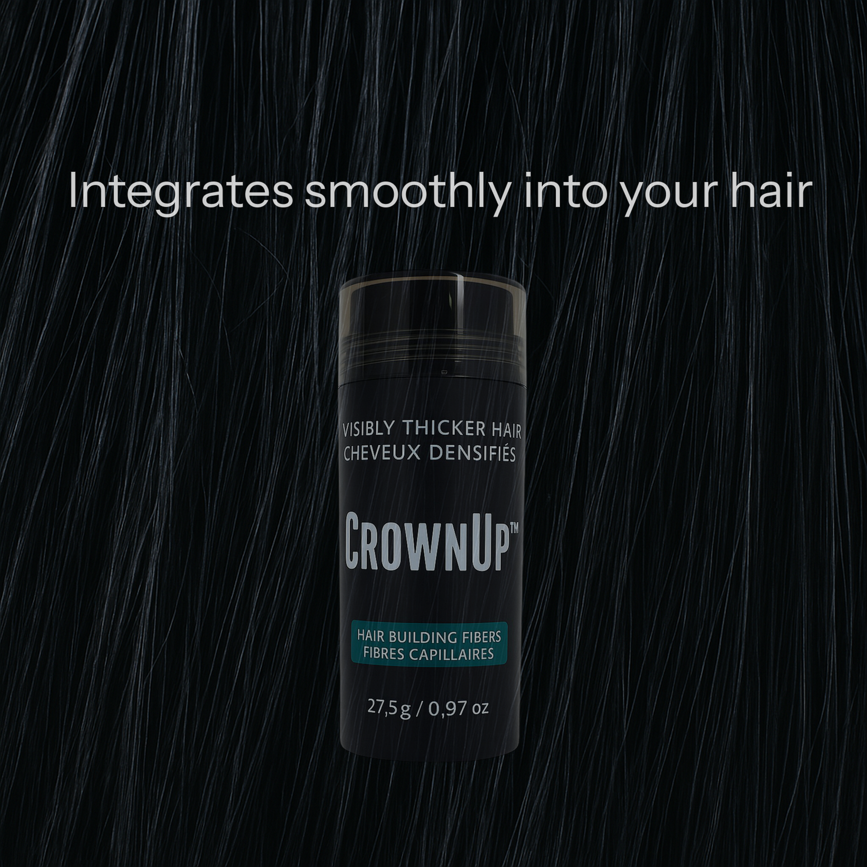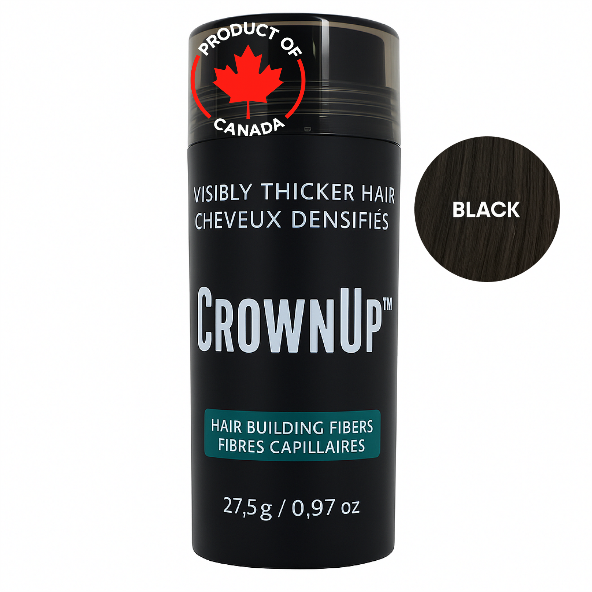 CrownUP Hair Building Fibers in Black is the perfect solution for thinning hair. Made with high quality keratin. Manufactured in Canada, this hair thickener effectively conceals bald spots and instantly gives a natural, fuller look. Boost your confidence with this professional-grade product.