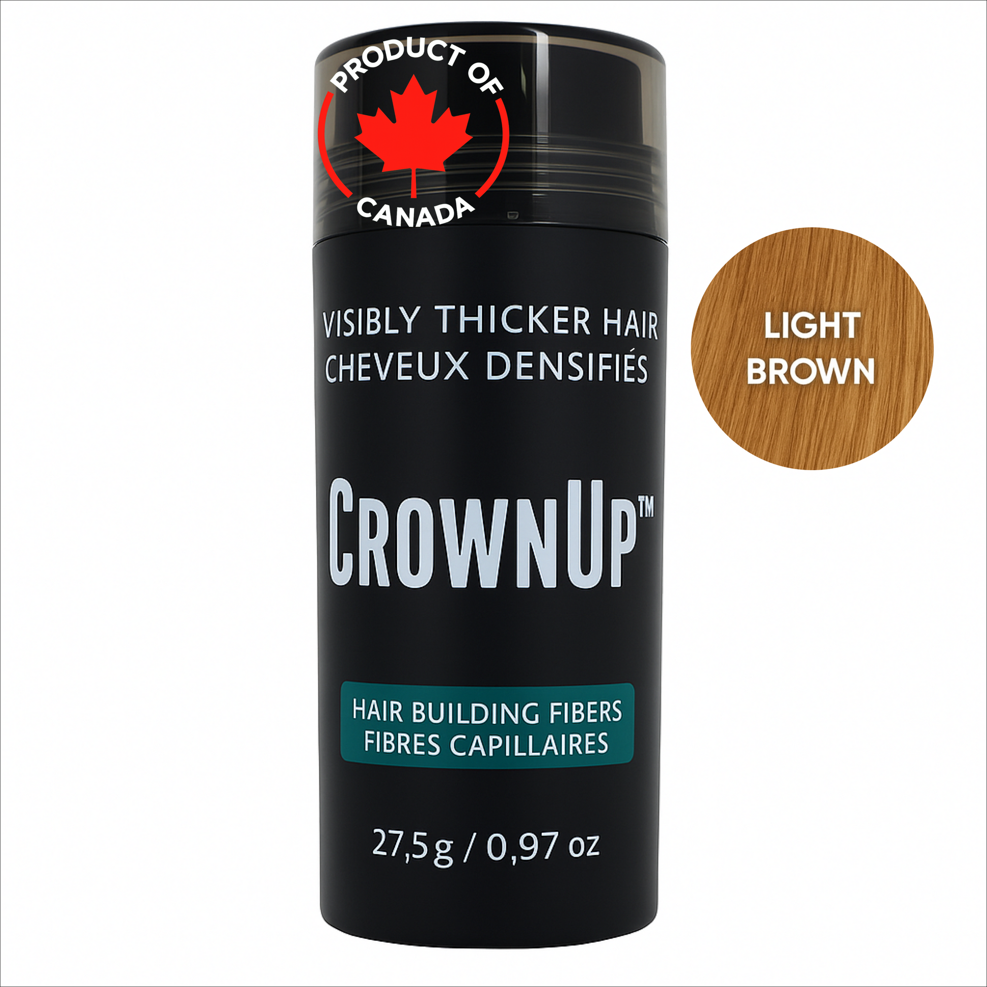 CrownUP Light Brown Hair Building Fibers instantly revive the look of thinning areas by adding soft, natural-looking fullness to your hair. Our finely cut keratin fibers blend smoothly with light brown shades, creating a warm and even coverage that stays invisible throughout the day.